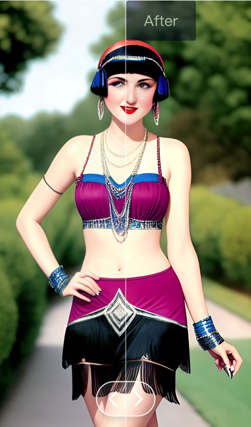 PROMPT: Piercing eyes, 1920s flapper wearing a 1970s tube top and 1990s bellybutton ring